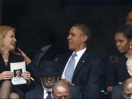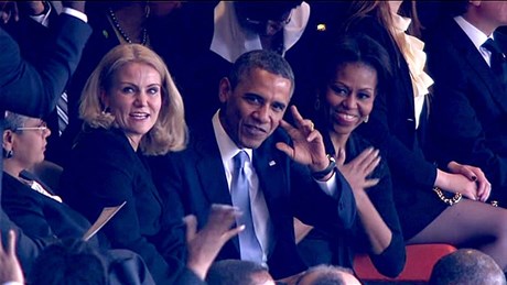 For some reason President Obama was seated next to the Danish Social Democratic Prime Minister Helle Thorning-Schmidt and British Prime Minister David Cameron. They seem to enjoy themselves immensely during the ceremony. It was probably taken during the sermon part of the eulogy, after the world leaders Obama and Raoul Castro had made their remarks. It took the U.S. news services over two hours to figure out who the lady in the middle was. Anyhow, she took a selfie of herself with Obama and Cameron. Is this any way for leaders of the free world to behave during a solemn ceremony?