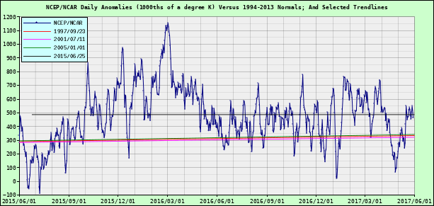 And how is the current global temperature trend performing right now? The “pause” is now over 19 years even though CO2 is increasing at 3 ppm (nearly one percent) per year! Here is a chart of the last few months.