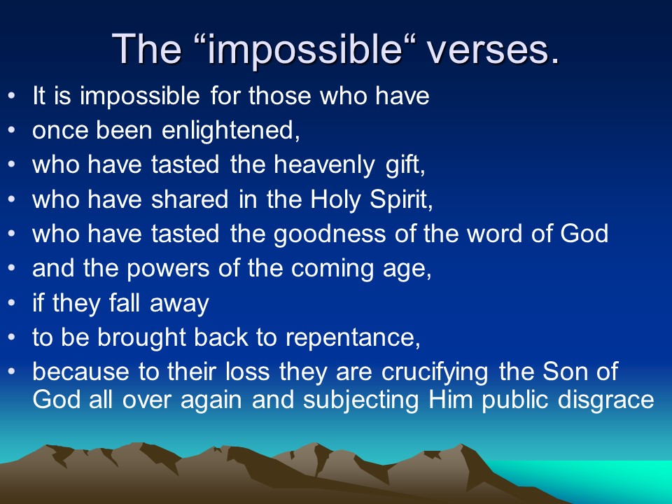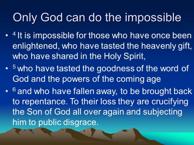 This is a clue to what the impossible verses really mean. Think of Jesus as the rock, which he is. God told Moses to speak to the rock , not strike it as he did the first time, but instead he struck the rock twice. Jesus was struck once at the cross for our sins, from now on we speak to Christ. The Hebrews came out of the sacrifice culture, and some looked wistfully at the time when they could atone for their sins yearly. The temple was still standing at the writing of this letter, and the pressure was high to go back to their old ways. After the cross there remains no more a sacrifice for sins, and this is why it says “To their loss they are crucifying the Son of God all over again and subjecting him to public disgrace.”