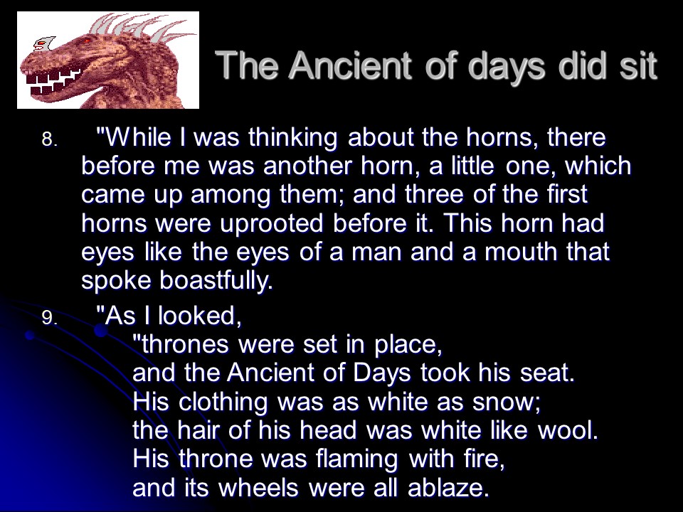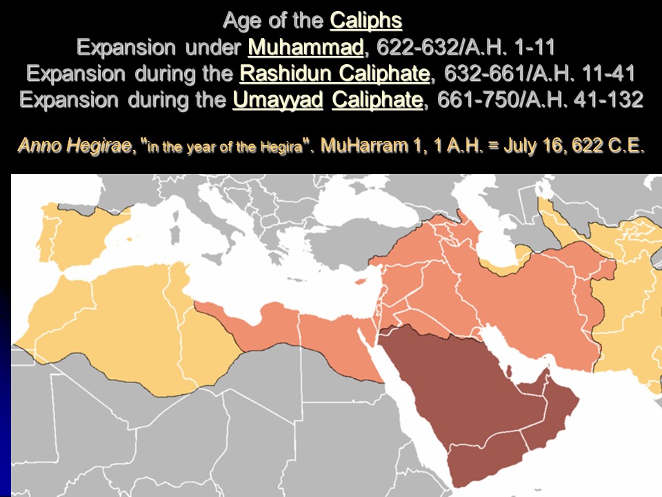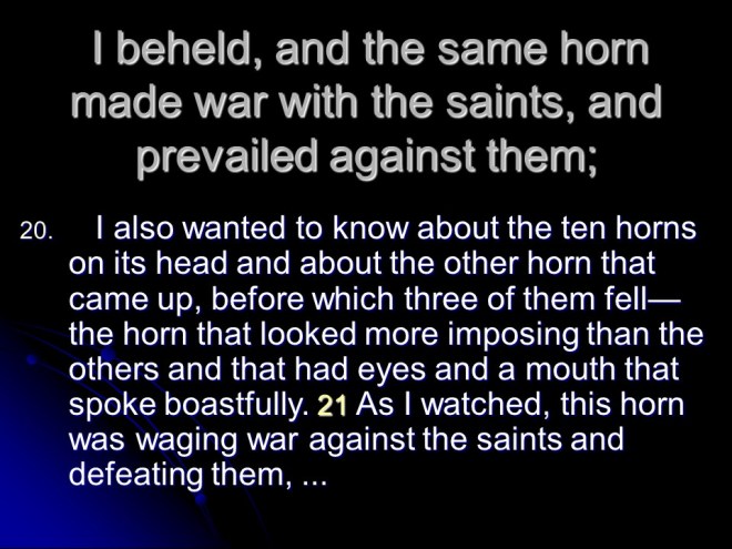There is another interpretation of Daniel’s prophecy of the horns. The horn that grew up is Muhammad. He had conquered the Arabian peninsula at his death in 632 A.D. In 100 short years under the Caliph  Umayyad  three large regions of the world had been conquered, the whole Middle East as far as Pakistan, Egypt and Northern Africa and Spain.