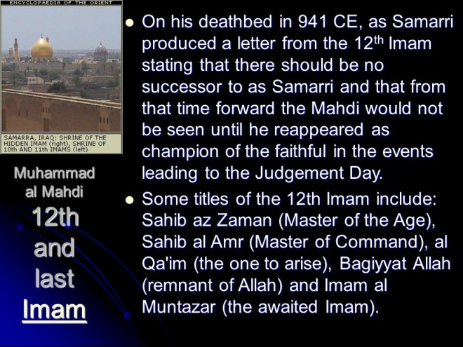 Who is this man? For Shiites he is the 12th Imam, coming out of a cistern in Qom in Iran. Sunnis  believe he will come out of a place near Babylon.