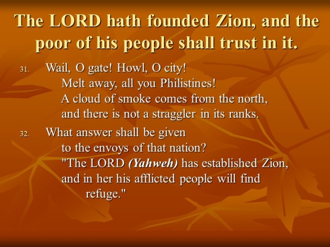 The destruction of Philistia is also foretold. It is interesting that the tribe of Dan could not take the land of the Northern Philistia, so they settled in the very northern part of Israel. Their failure to take their allotment of the promised land continues to this day.