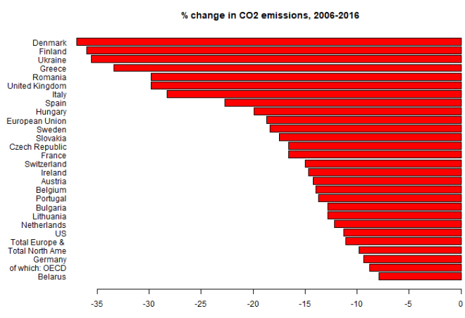 Our European friends are quite upset about this. After all, countries like Denmark and Germany have the highest residential electricity rates in the world to pay for their wind and solar power installed. Here are the countries with reduced CO2 emissions this century:
