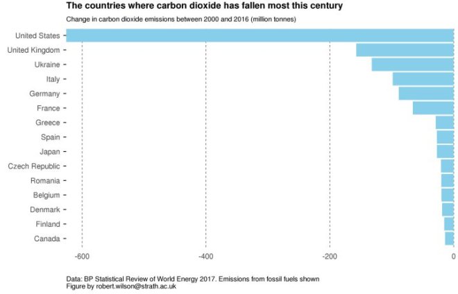 But if one looks at the absolute decline in CO2 emissions, the U.S. leads the pack hands down: