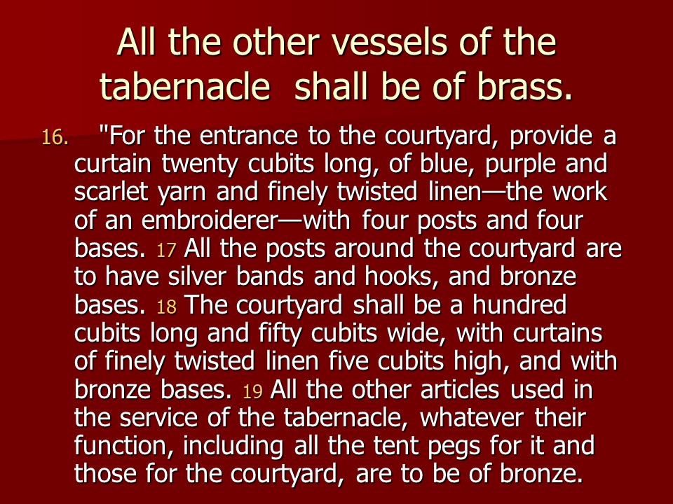 Exodus 27, the Altar of Burnt Offering, the Tabernacle Courtyard, oil for the Lampstand.