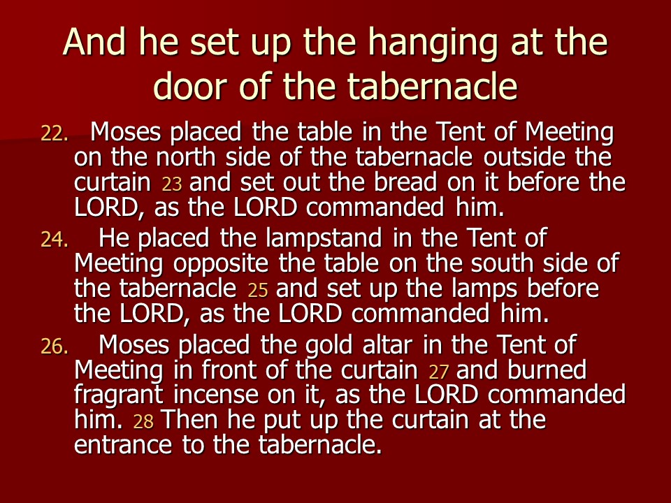Exodus 40, setting up the Tabernacle, Glory to the LORD!