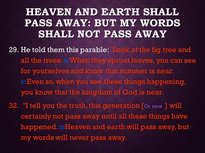 Luke 21, The Widow’s two Mites, the Signs of the Times, the End of the Age, the Destruction of Jerusalem, the Coming of the Son of Man, the Parable of the Fig Tree.