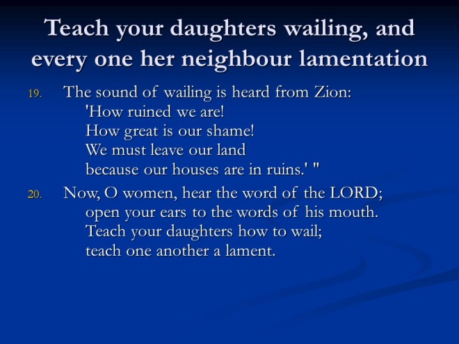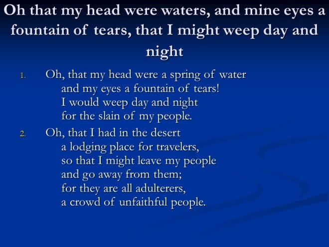 Jeremiah 9, Jeremiah mourns for the People, the People mourn in Judgment.