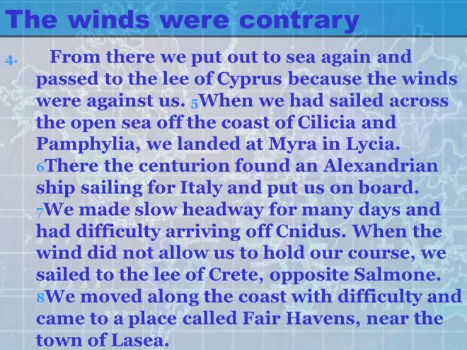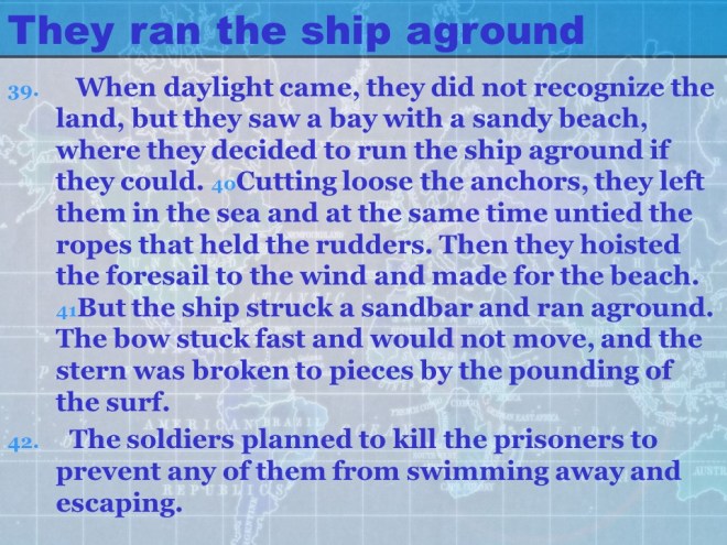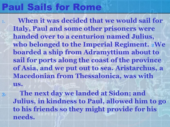 Acts 27, Paul’s Voyage to Rome, Paul’s warning ignored, the Storm, Shipwrecked on Malta.