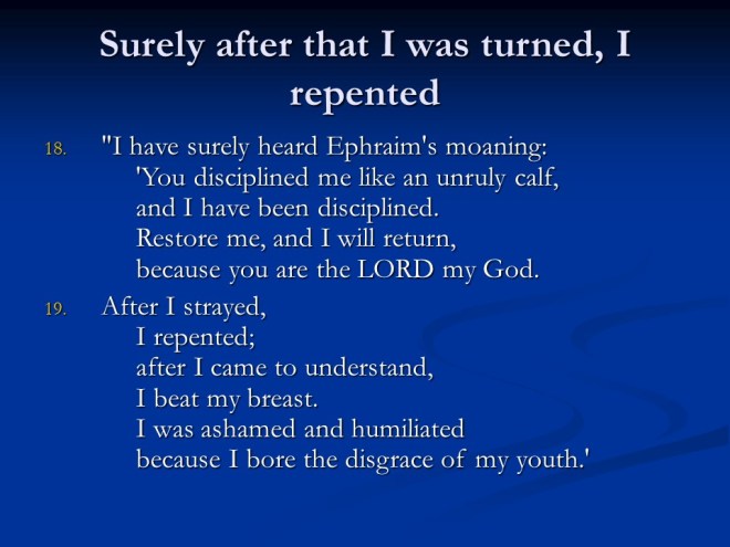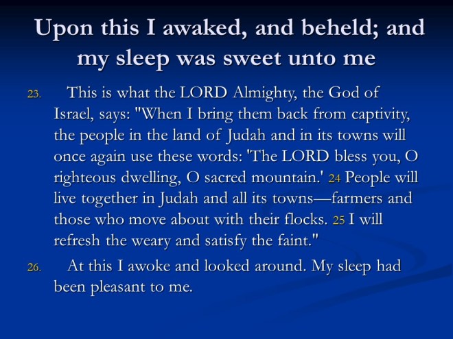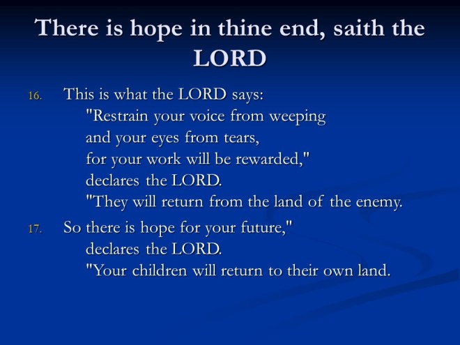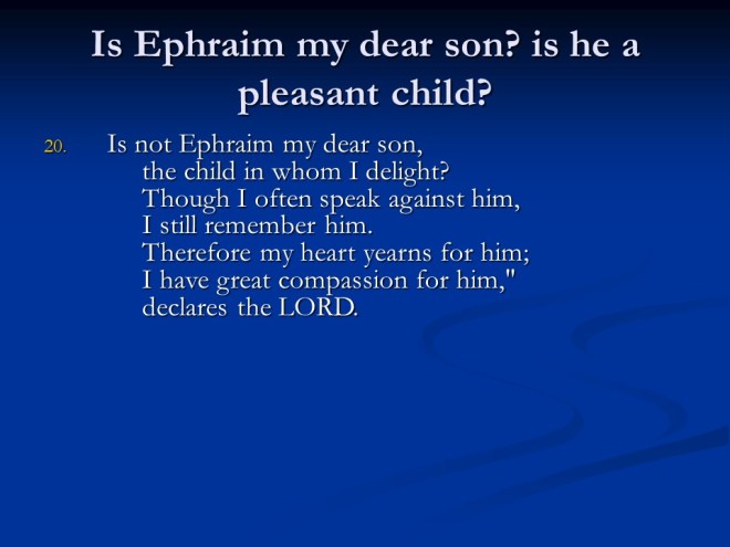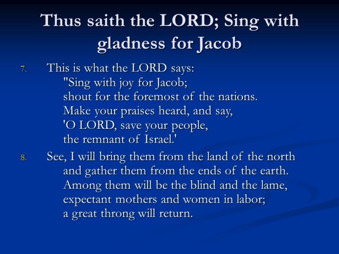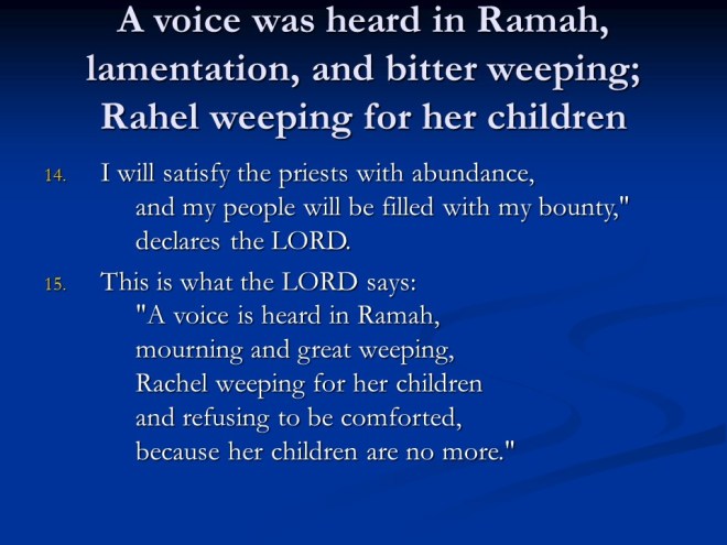 Jeremiah 31, the Remnant of Israel saved, a voice was heard in Ramah, Mercy on Ephraim, future Prosperity to Israel, the New Covenant.
