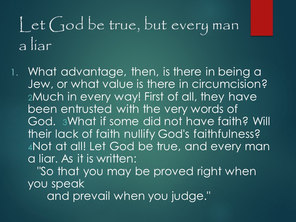 Romans 3, God’s faithfulness, God’s Judgment, all have Sinned, No One is Righteous, God’s Righteousness through Faith, Boasting Excluded.
