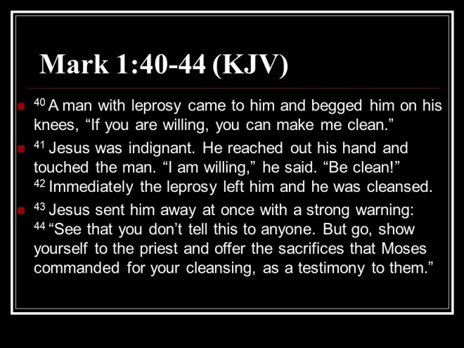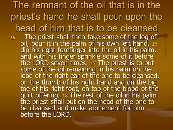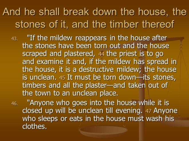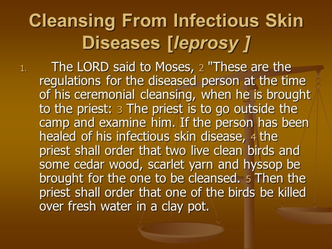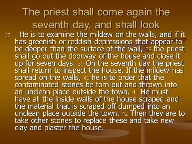 Leviticus 14, the Ritual for Cleansing healed Lepers, the Law on cleansing from Mildew.