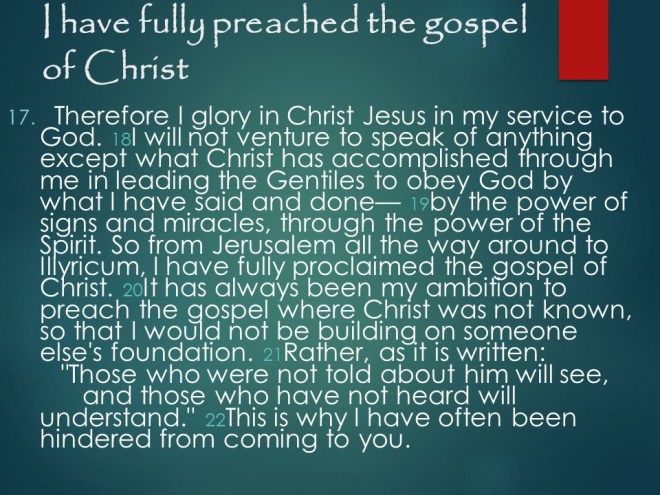 Romans 15, Bearing Others’ Burdens, Glorify God Together, From Jerusalem to Illyricum, Paul to visit Rome.