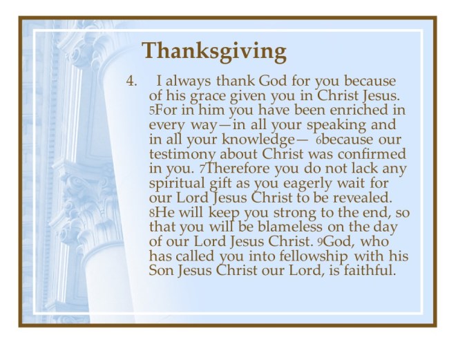 1 Corinthians 1, Greeting from Paul, Spiritual Gifts at Corinth, Sectarianism is Sin, Christ the Power and Wisdom of God, Glory only in the Lord.