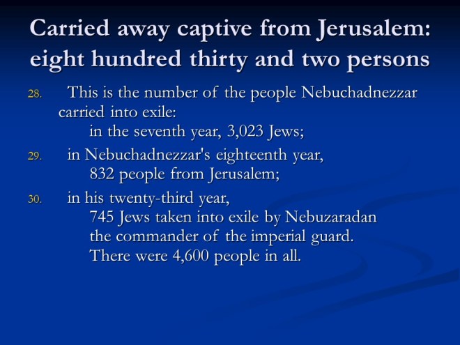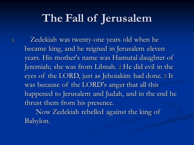 Jeremiah 52, the Fall of Jerusalem, the Temple Plundered and burned, Captivity to Babylon, Jehoiachin Released.