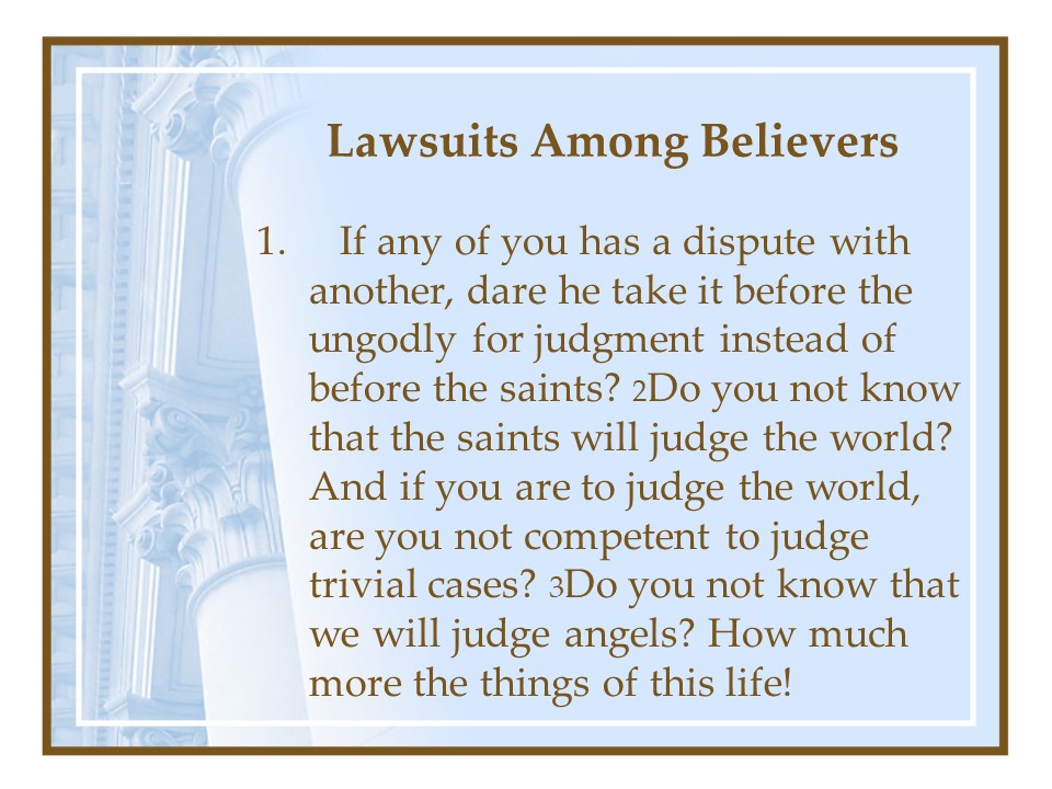 1 Corinthians 6, do not Sue the Brethren, Glorify God in Body and Spirit.