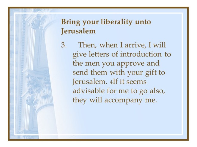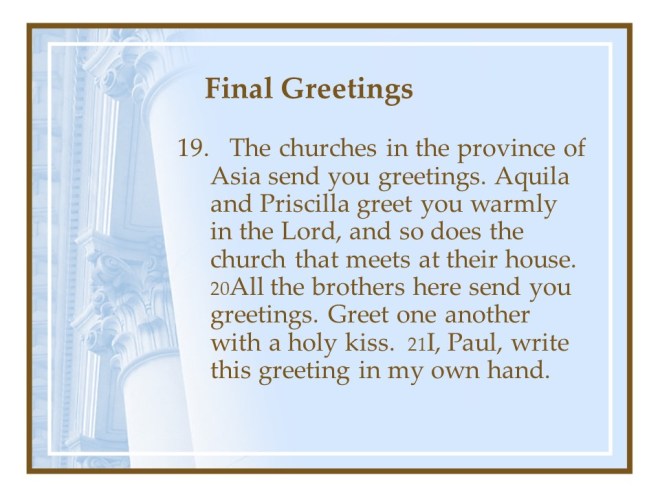 1 Corinthians 16, Collection for the Saints, Personal Plans, Final Exhortations, Final Greetings and Farewell.