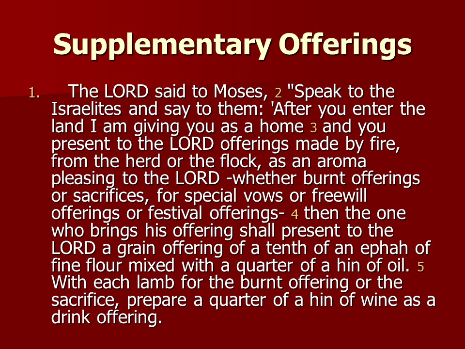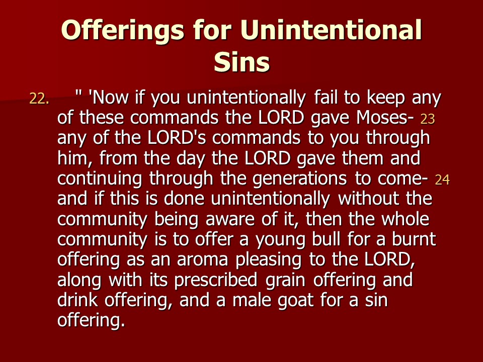 Numbers 15, Laws of Grain and Drink Offerings, Laws Concerning Unintentional Sin, Laws concerning Presumptuous Sin, Penalty for Violating the Sabbath, Tassels on Garments.