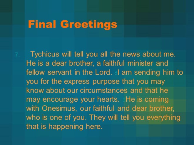 Colossians 4, Christian Graces, Final Greetings, Exhortation, Blessing.