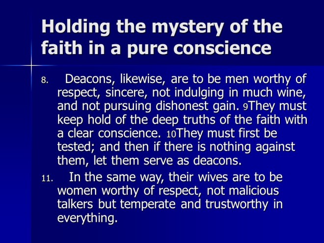 1 Timothy 3, Qualifications of Overseers, Qualifications of Deacons, The Great Mystery.