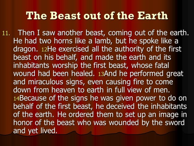 Revelation 13, The Beast from the Sea, The Beast from the Earth.