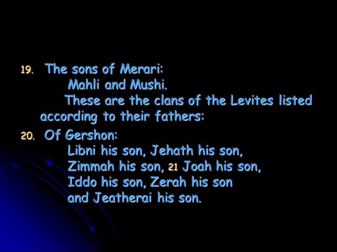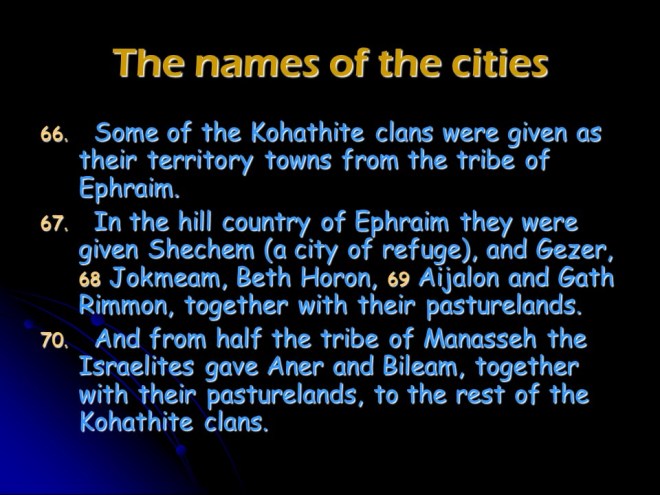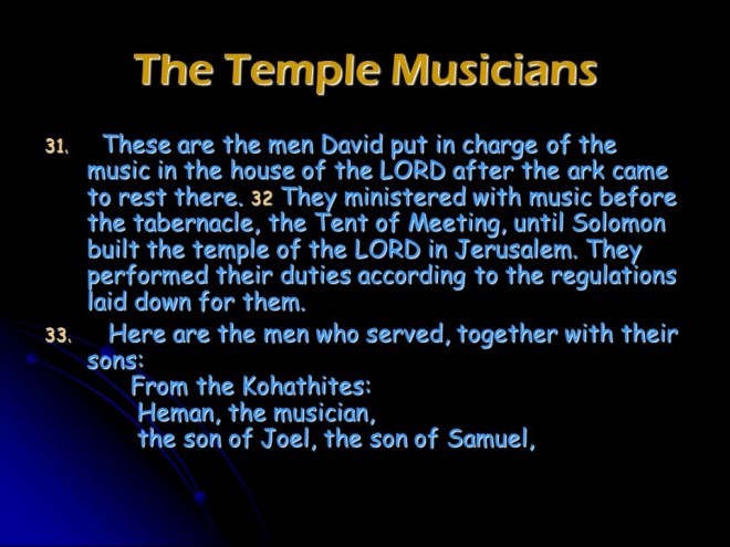 1 Chronicles 6, The Family of Levi, Musicians in the House of the Lord, The Family of Aaron, Dwelling Places of the Levites.