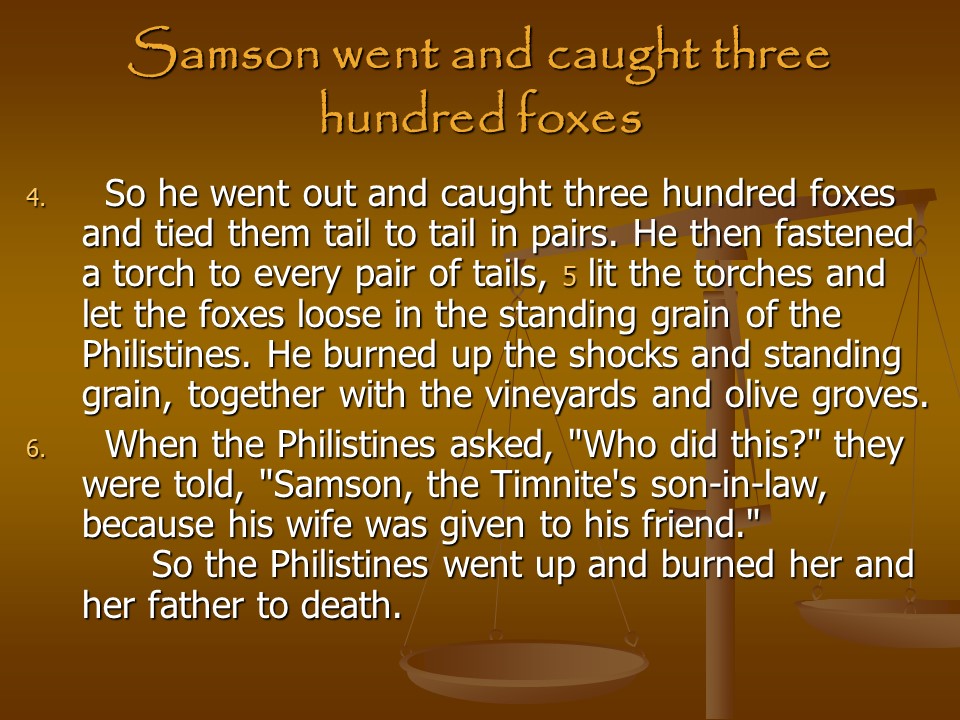 Judges 15, Samson Defeats the Philistines.