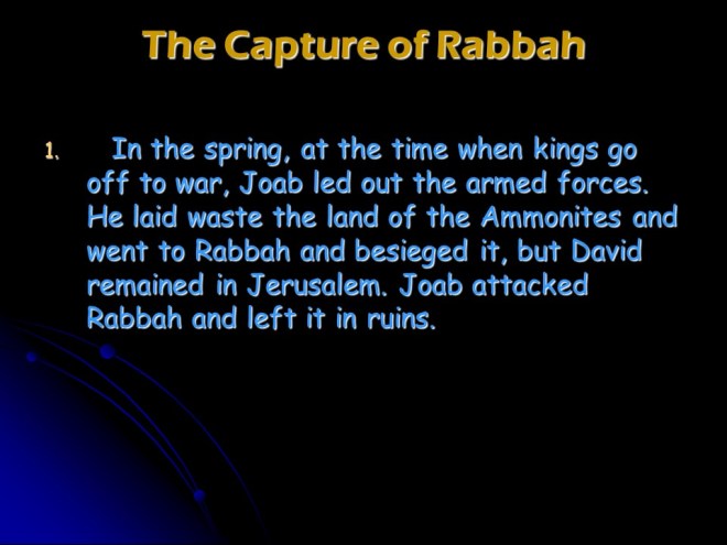 1 Chronicles 20, Rabbah is Conquered, Philistine Giants Destroyed.