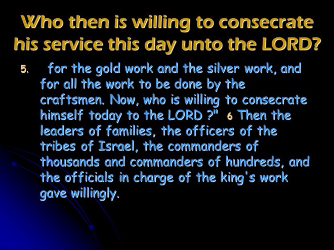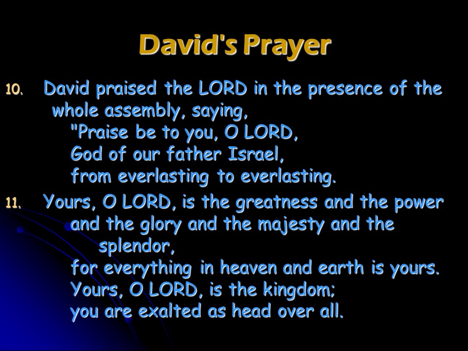 1 Chronicles 29, Offerings for Building the Temple, David’s Praise to God, Solomon Anointed King, The Close of David’s Reign.