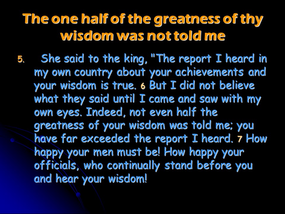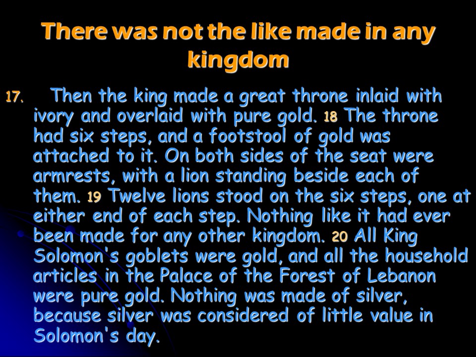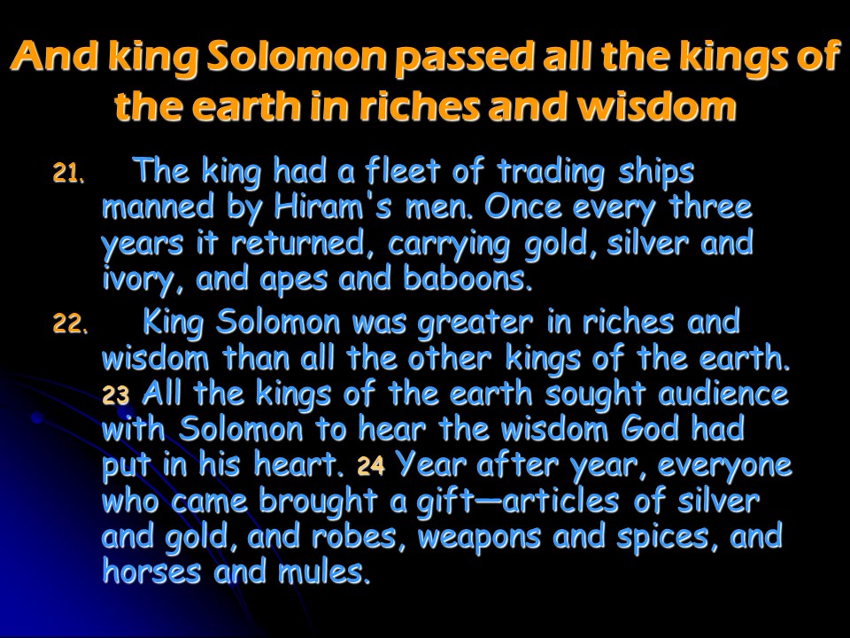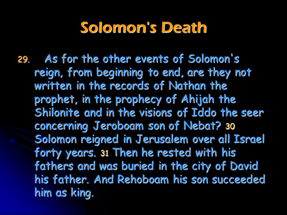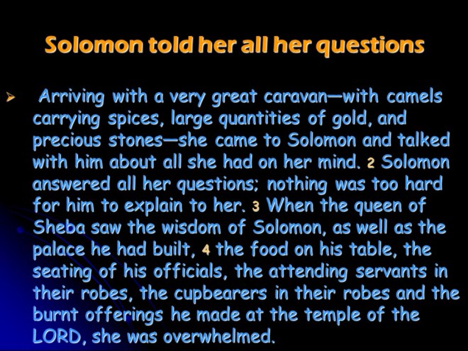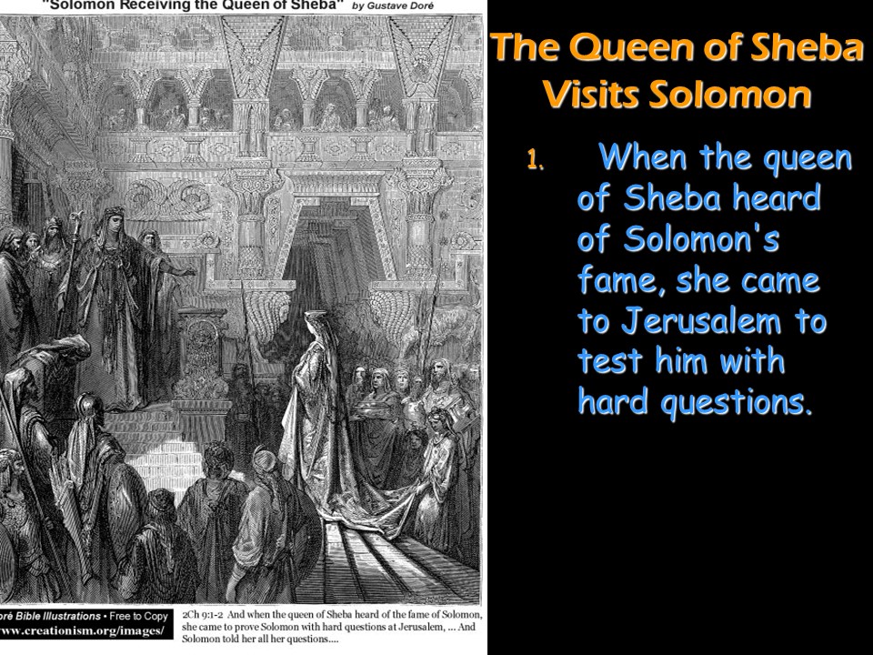 2 Chronicles 9, The Queen of Sheba Praises Solomon, Solomon’s Wealth, Death of Solomon.