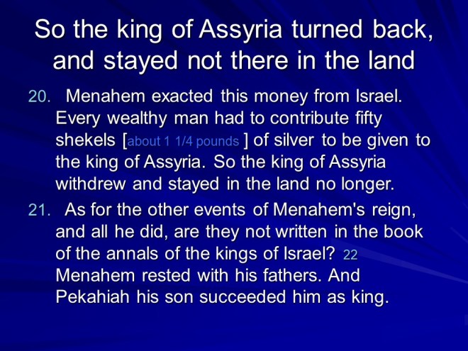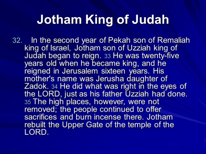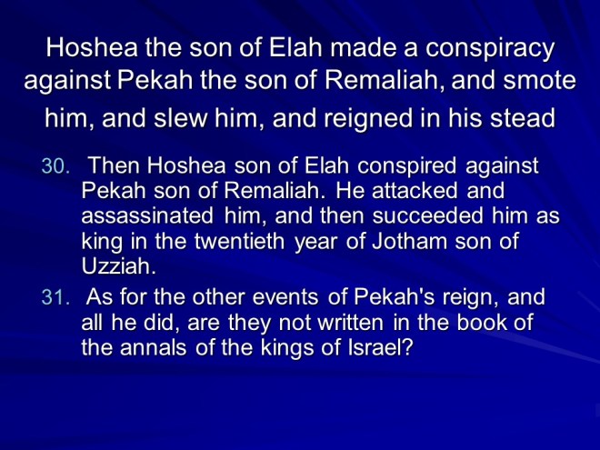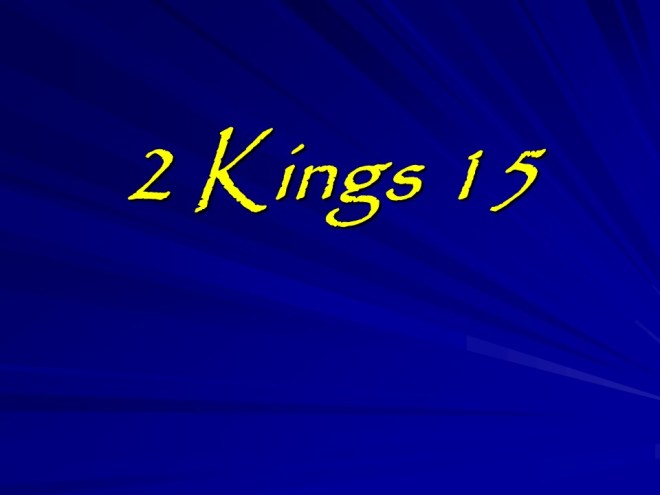 2 Kings 15, Azariah Reigns in Judah, Zachariah Reigns in Israel, Shallum Reigns in Israel, Menahem Reigns in Israel, Pekahiah Reigns in Israel, Pekah Reigns in Israel, Jotham Reigns in Judah.