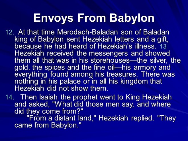 2 Kings 20, Hezekiah’s Life Extended, The Babylonian Envoys, Hezekiah’s Death.