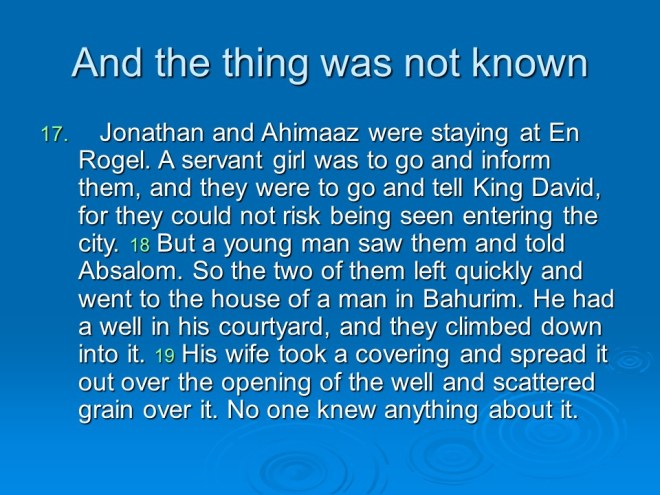 2 Samuel 17, the Advice of Hushai, Hushai Warns David to Escape.