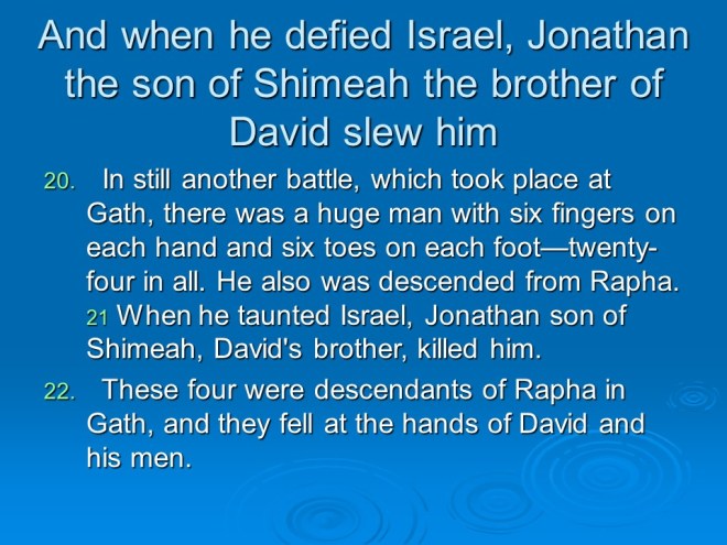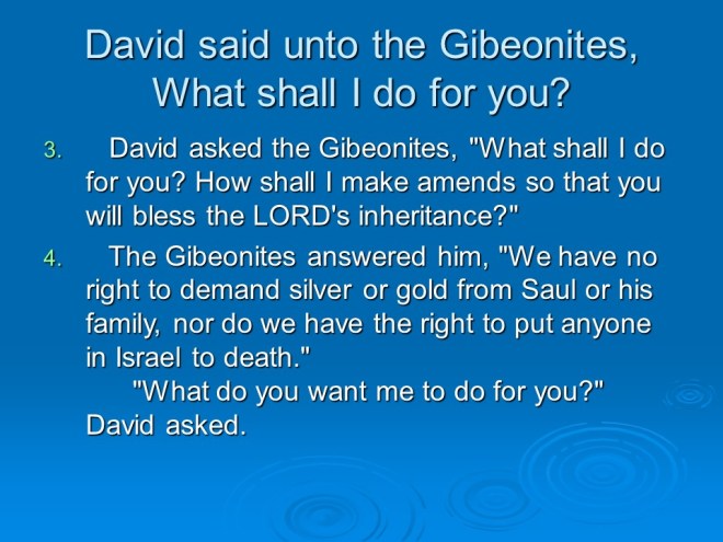 2 Samuel 21, David Avenges the Gibeonites, Philistine Giants Destroyed.