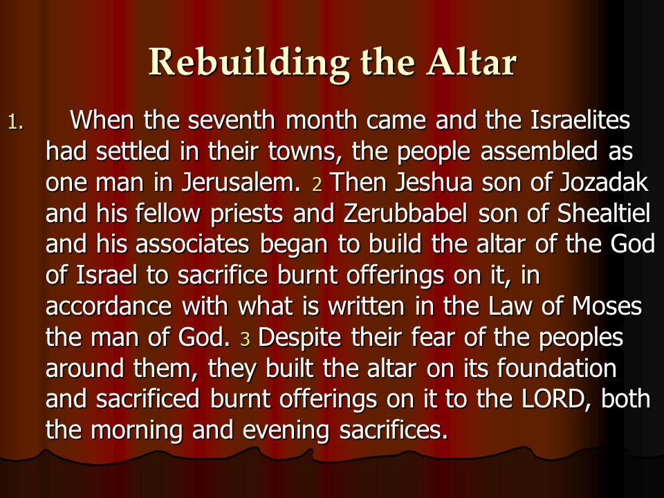 Ezra 3, Worship Restored in Jerusalem, Restoration of the Temple Begins.