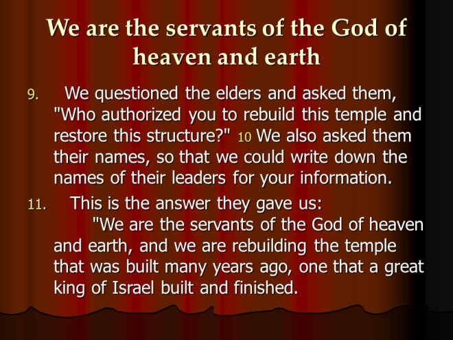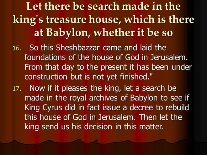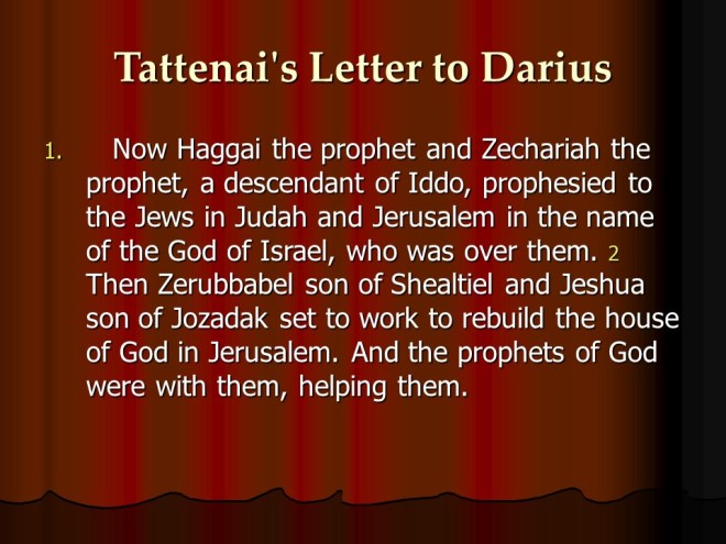 Ezra 5, Restoration of the Temple Resumed.