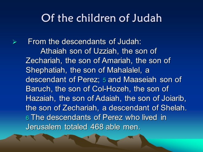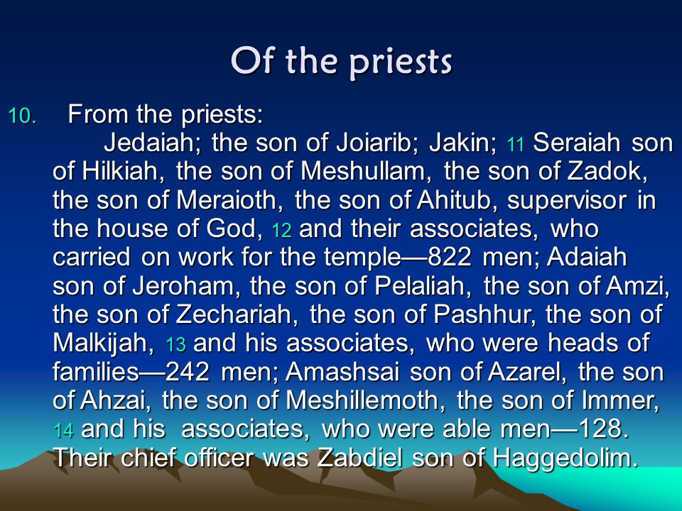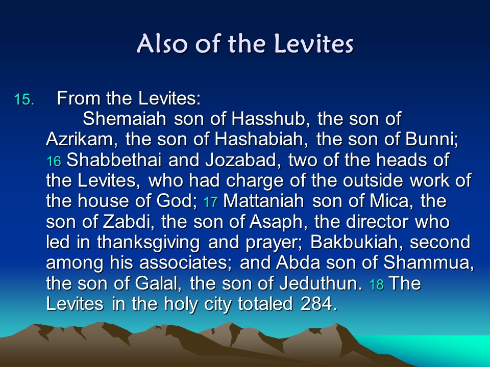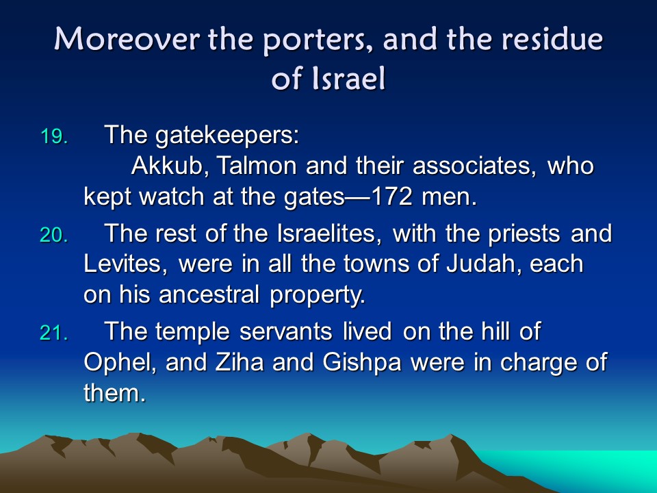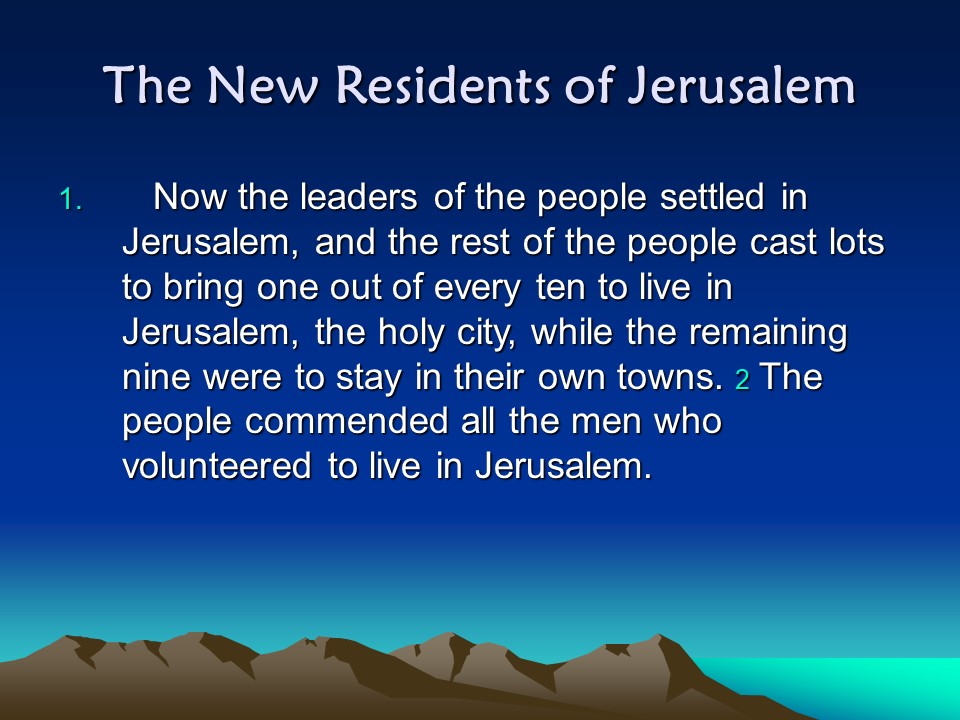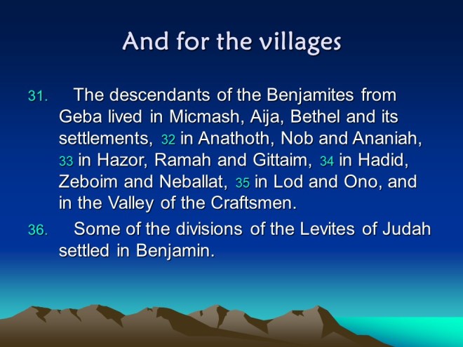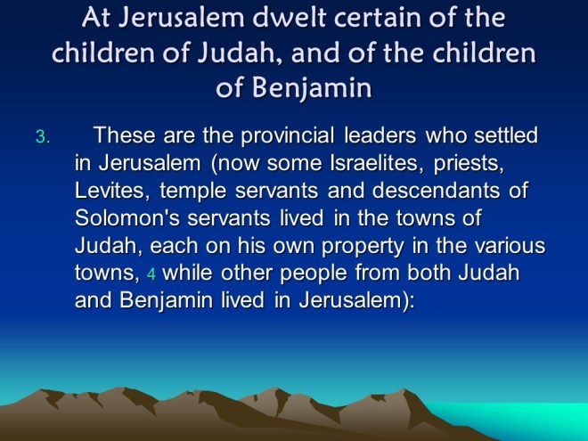 Nehemiah 11, The People of Jerusalem, the People outside Jerusalem.