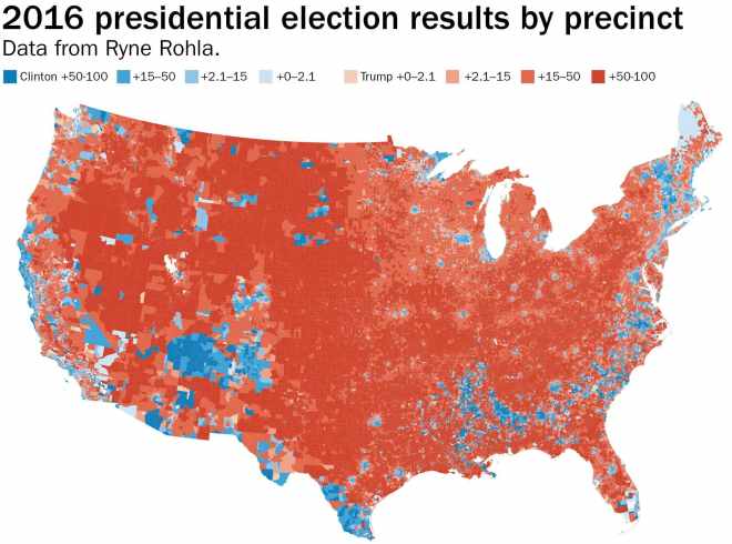 Republicans live in over 90% of the area of the United States, Democrats are concentrated to urban areas, and in areas of majority black or Hispanic population.