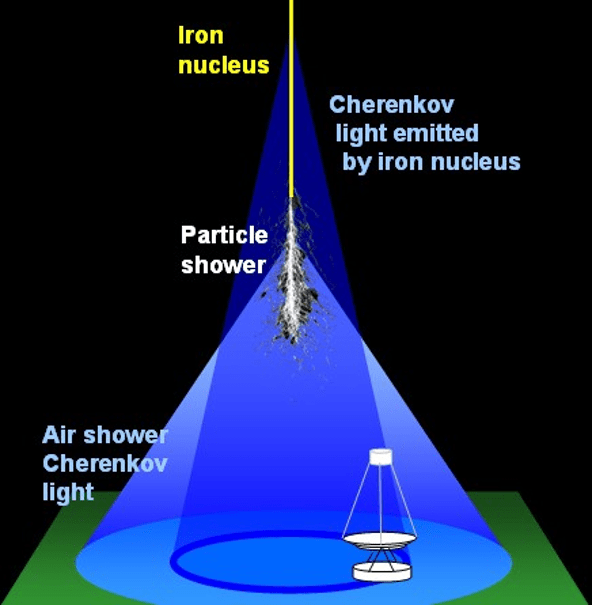 The iron nuclei enter the earth’s atmosphere with a speed that exceeds the speed of light in atmosphere, causing this eerie blue light. It spreads like a sonic boom.