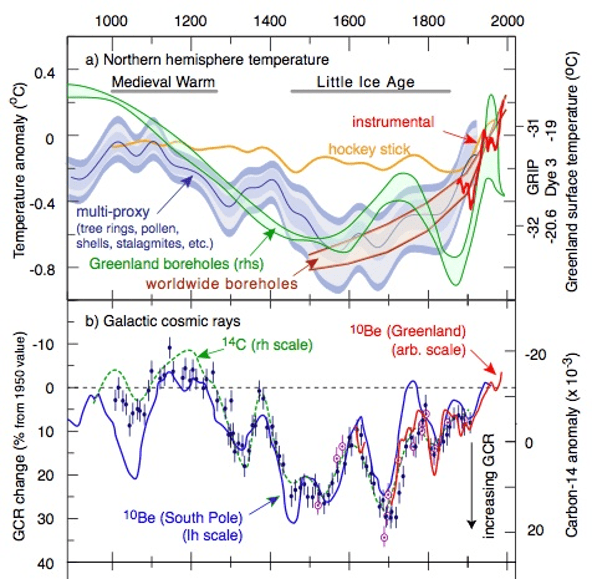 Especially interesting is cosmic radiation that does not come from the sun. It varies a lot, and consists mostly of iron nuclei and comes from distant supernovas. There was two of them, in 1572 and 1604 A.D., both shone brighter in the sky than Venus. Since then we have not seen any supernovas anywhere nearly as bright . Did they trigger the little ice age?