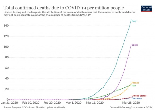 Italy is doing poorly with an over 11% death rate, Spain next with 8, France is slowly increasing, but not as slow as Iran, which has different travel habits between cities and villages. United States and Germany show a very similar pattern, and both countries have excellent health systems with by far the most emergency rooms per capita of any nation.