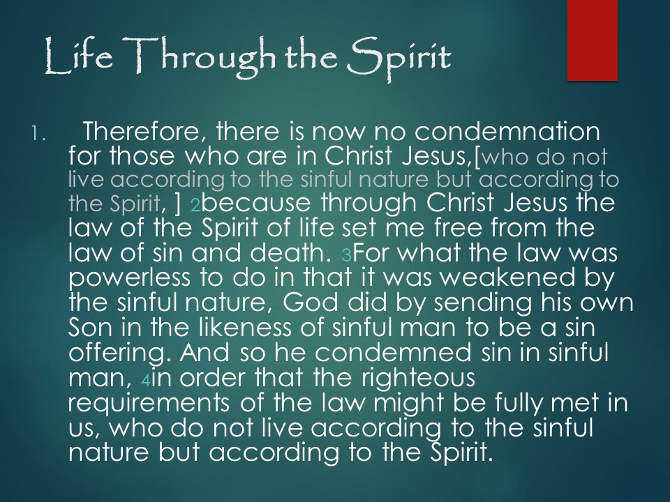Romans 8:1-27, now no Condemnation in Christ Jesus, Life through the Spirit, Sonship through the Spirit, from Suffering to Glory.