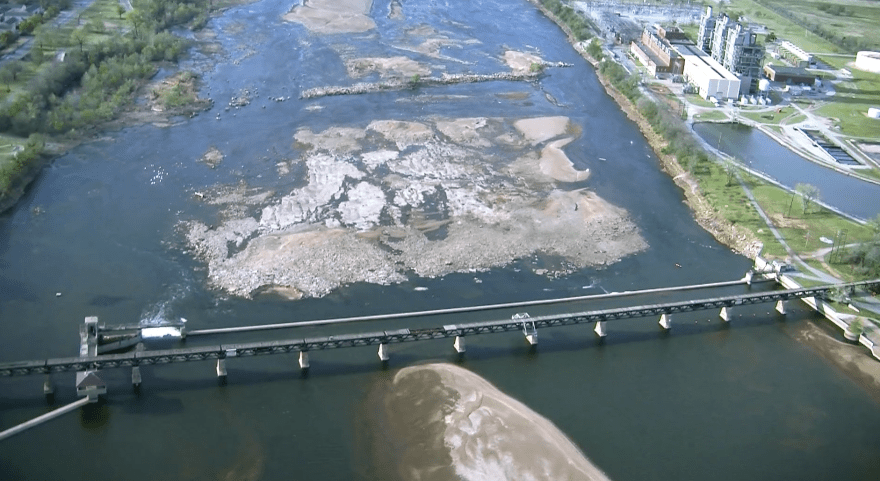 The proposal is this: Build 4 30′ dams with full opening gates so up to 250,000 cfs can be released. There will be a power house in each, containing two 5,600 cfs pumps/generators. Through Tulsa build three 10′ dams with the same capacity as the four lower dams. Lower the river bed all over by at least six feet to lessen the occurrence of floods. Since the barge canal separates from the Arkansas River before the first new dam on the Arkansas River there is now more liberty to adjust the pumping to meet the electricity needs and momentarily shut off the pumping when energy needs spike.