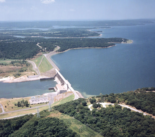 The Robert S Kerr reservoir has an area of 43,000 acres and its elevation is regulated by the McClellan-Kerr Arkansas River Navigation System. This means that the water can be pumped up or released as long as it is coordinated for the whole canal system. This also means that the water flow can be stopped and the power normally used to pump up water can be used as peak power, which can come in handy on a hot humid day with no sun and no wind and every air conditioner in the area is going full blast to take out the oppressive humidity.