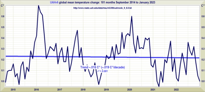 Over these 101 months (8 years and 5 months) the level of CO2 has risen 5% and Methane has risen 3.5%.