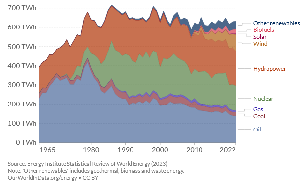 Sweden is perhaps the “greenest” country on earth. Their electric supply is a healthy mix of hydropower, wind, solar and biomass to make things go when the sun doesn’t shine and the wind doesn’t blow. Many cities are well planned where nearly all residential heat comes from spillheat from power plants. In Linköping the year 1967 the whole town was heated with surplus electricity during the spring flood. No house was allowed to have a fireplace in the regulated zone (except the city Architect’s and 3 other townhouses that somehow escaped the ordinance.) The energy use looks like this for Sweden: