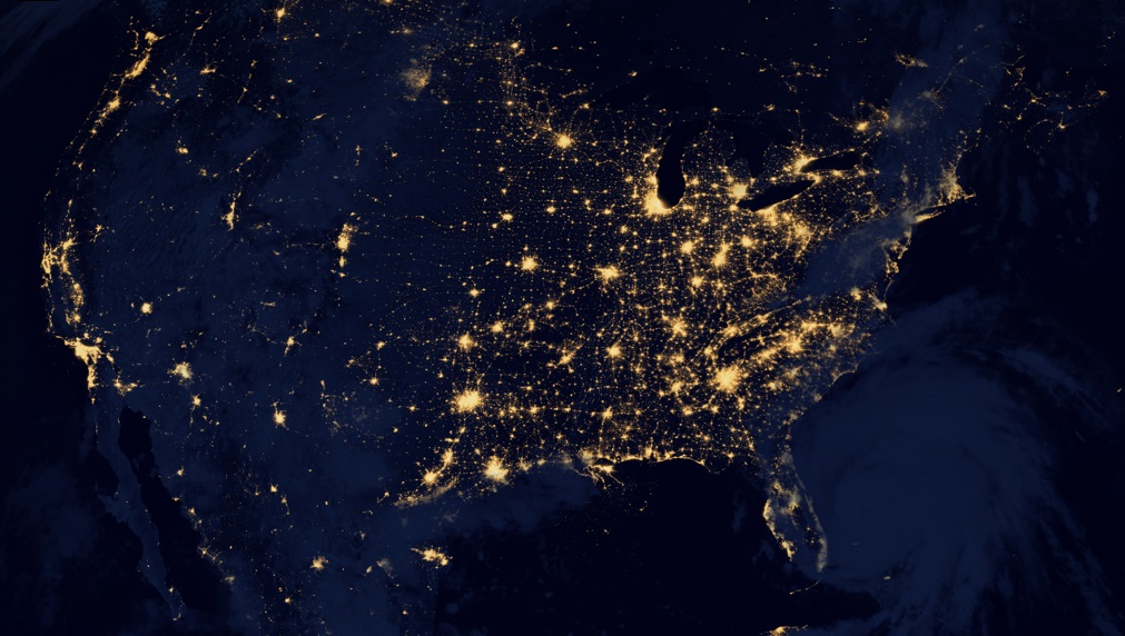 This is a satellite photo of a mostly clear night over U.S. (There are a few clouds over eastern U.S.) It shows clearly where the big cities are, and how empty the western half of U.S. is compared to the eastern half. From this we can see and guess the size of the major metropolitan areas. Looking over North Dakota there seems to be a city of about half a million people judging from the light. But North Dakota has no big cities! What is going on?