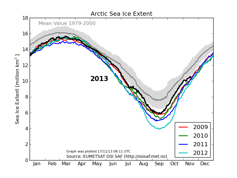 You don’t believe me? Check out the growth in Antarctic ice and the reversal of the Arctic Ice decrease. (The freezing point of water is a constant, so if if the ice is growing it must get colder.)