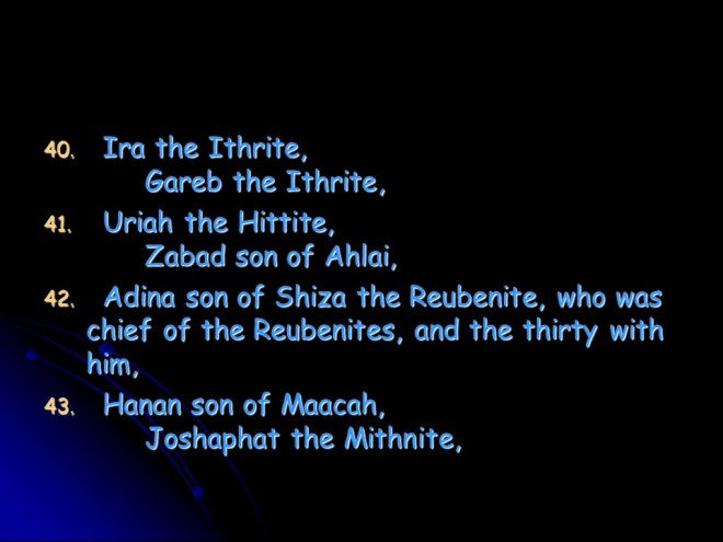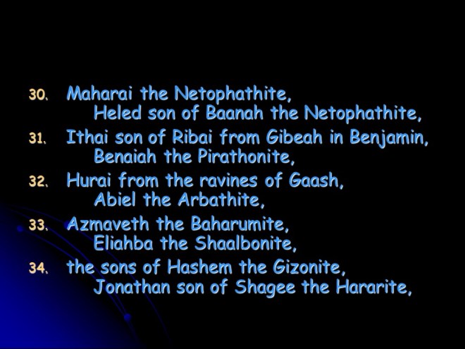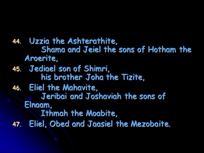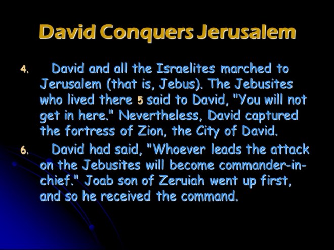 1 Chronicles 11, David made King over Israel, The City of David, David’s Mighty Men. 1 Chronicles 11, David made King over Israel, The City of David, David’s Mighty Men.