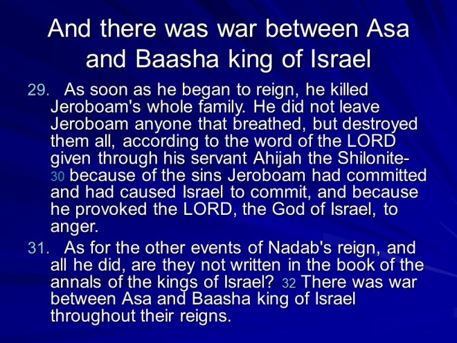 1 Kings 15, Abijam Reigns in Judah, Asa Reigns in Judah, Nadab Reigns in Israel, Baasha Reigns in Israel.